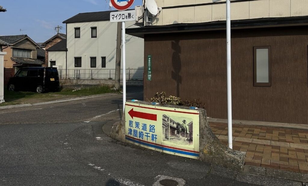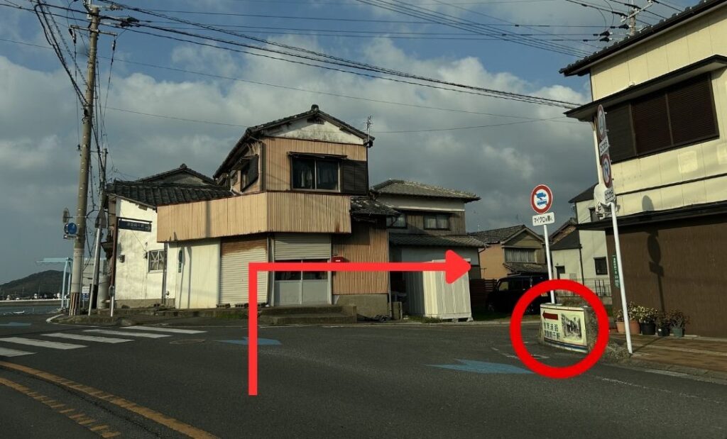 右側の黄色い丸の丸に、【散策道路 津屋崎千軒】の看板があります!