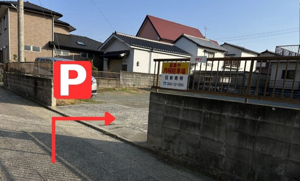 右側に駐車場がございます右折してください。