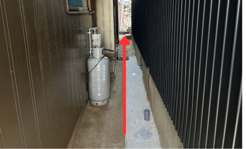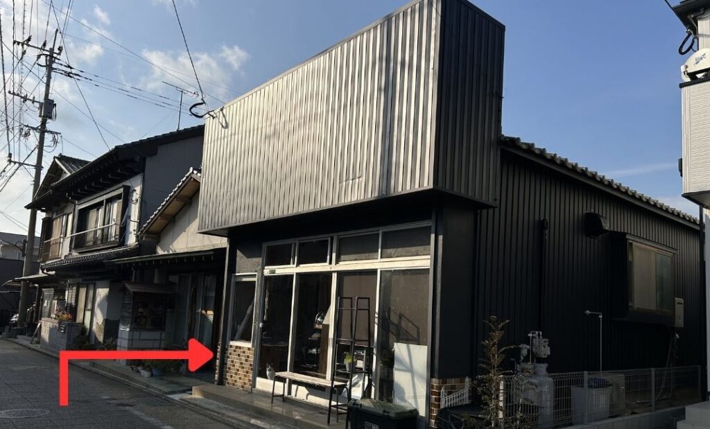 グレーの鉄板の建物です。鍼灸院の入口は、右横のお隣さんの隙間からになります。