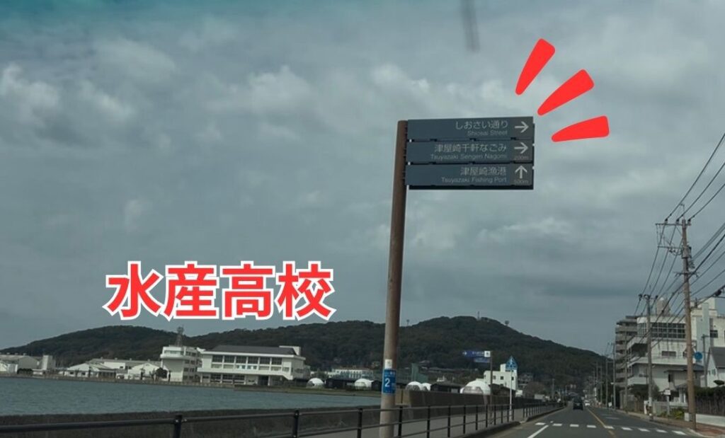 左奥に丸い白いドームのグランピング施設と、水産高校が見えてきます。
